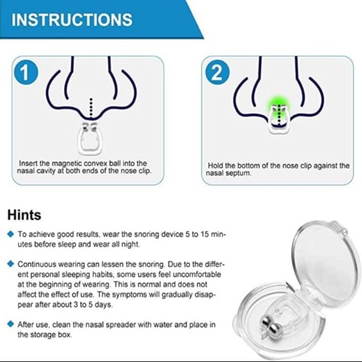 ব্যবহারবিধিঃ নাকে আলতোভাবে ক্লিপটি পরুন এবং স্বাভাবিকভাবে ঘুমিয়ে পড়ুন। নিয়মিত ব্যবহার করলে নাকডাকা কমাতে সাহায্য করে।